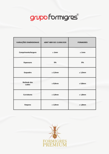 Todas as especificações da Linha Formigres Premium são baseadas na Norma ABNT NBR ISO 13006 e ISO 10545 e certificadas pelo Centro Cerâmico do Brasil, órgão responsável pela certificação.
